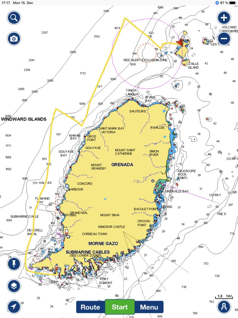 Am 15. Dezember stachen wir endlich wieder in See, lang genug war die Zeit in der Prickly Bay auf Grenada und ich war froh, endlich etwas Neues sehen und erkunden zu können. Zusammen mit meinem Buddy Boat APOLLON&DAPHNE ging es zunächst über Ronde Island nach Carriacou. Ronde Island ist eine kleine, unbewohnte Insel zwischen Grenada und Carriacou. Neben ihr befindet sich ein aktiver Unterwasservulkan, um den eine Sperrzone eingerichtet ist. Wenn der Vulkan Aktivität zeigt, wird die Sperrzone ausgeweitet und man kommt gar nicht auf die Insel.